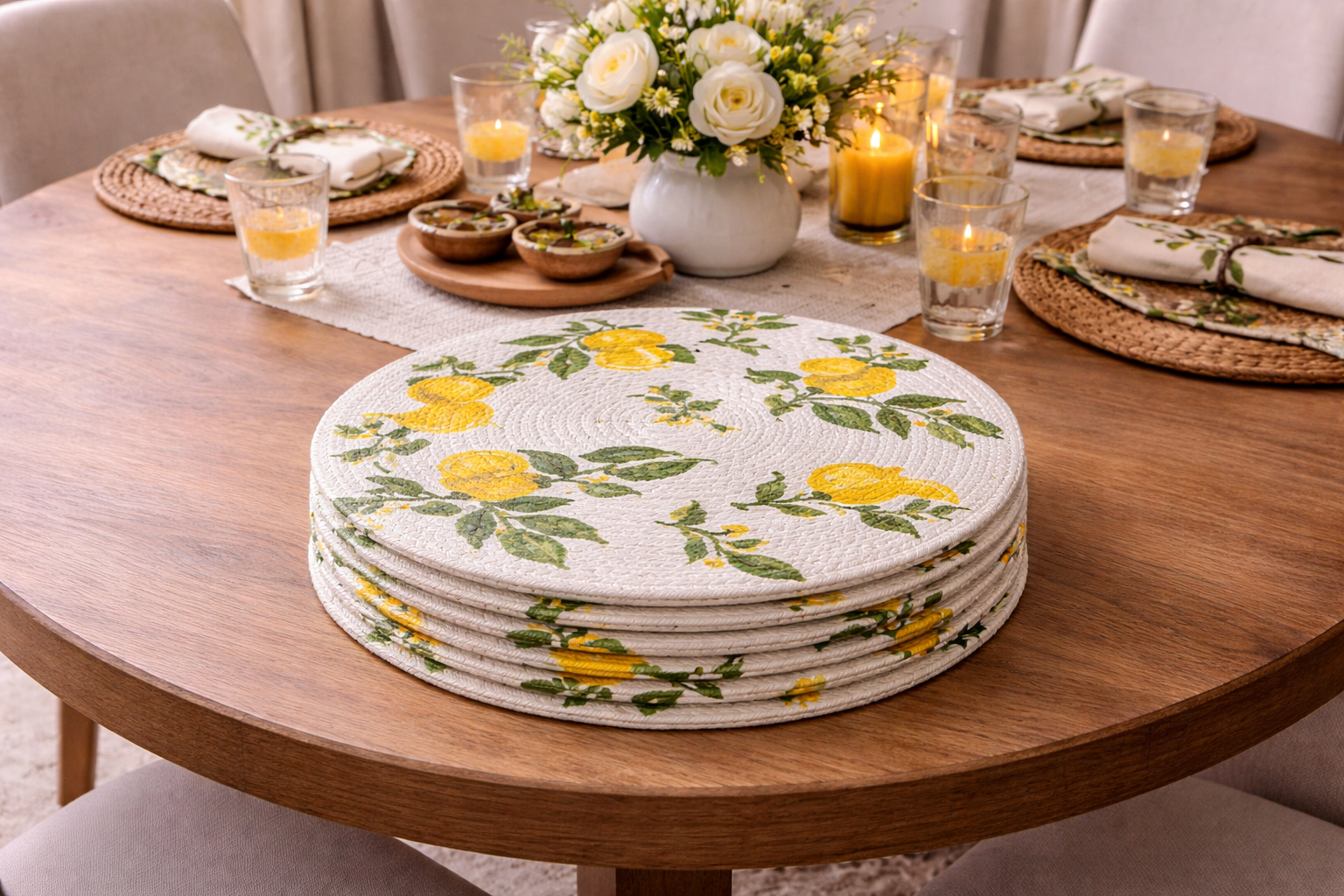 Lemon Blossom Cotton Round Placemats – Botanical Dining Table Mats | Amaré Living